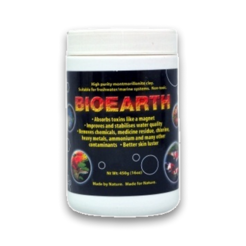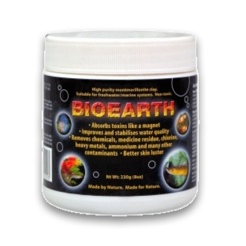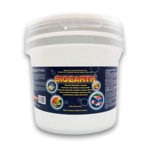 BIOEARTH is a natural calcium montmorillonite clay that attracts and removes toxins, bacteria, and waste like a magnet, while releasing essential minerals that benefit both fish and plants. Suitable for freshwater and marine systems, it purifies and stabilises water quality by eliminating chemicals, heavy metals, and other contaminants. Regular use promotes fish growth, digestion, and disease resistance, enhances colour and skin luster, and creates a clean, natural, stress-free aquatic environment.
